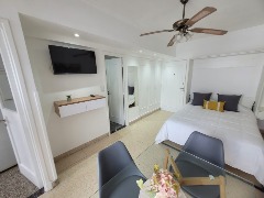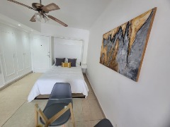 - Cuenta con cama matrimonial, mesa redonda de vidrio, sillas Eames, sillones y mesa símil yute.